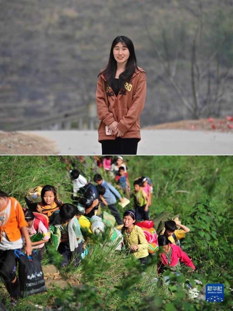拼版照片:上圖為2023年5月27日,22歲的蒙秋艷站在她就讀的廣西醫(yī)科大學(xué)校門口(新華社發(fā));下圖為2012年9月3日,在大化瑤族自治縣板升鄉(xiāng)弄雷村哈保屯,11歲的蒙秋艷(右一)在懸崖邊護(hù)著低年級的小伙伴回家(新華社記者黃孝邦攝)。2021年,蒙秋艷以優(yōu)異的成績,考取廣西醫(yī)科大學(xué)。   新華社發(fā)