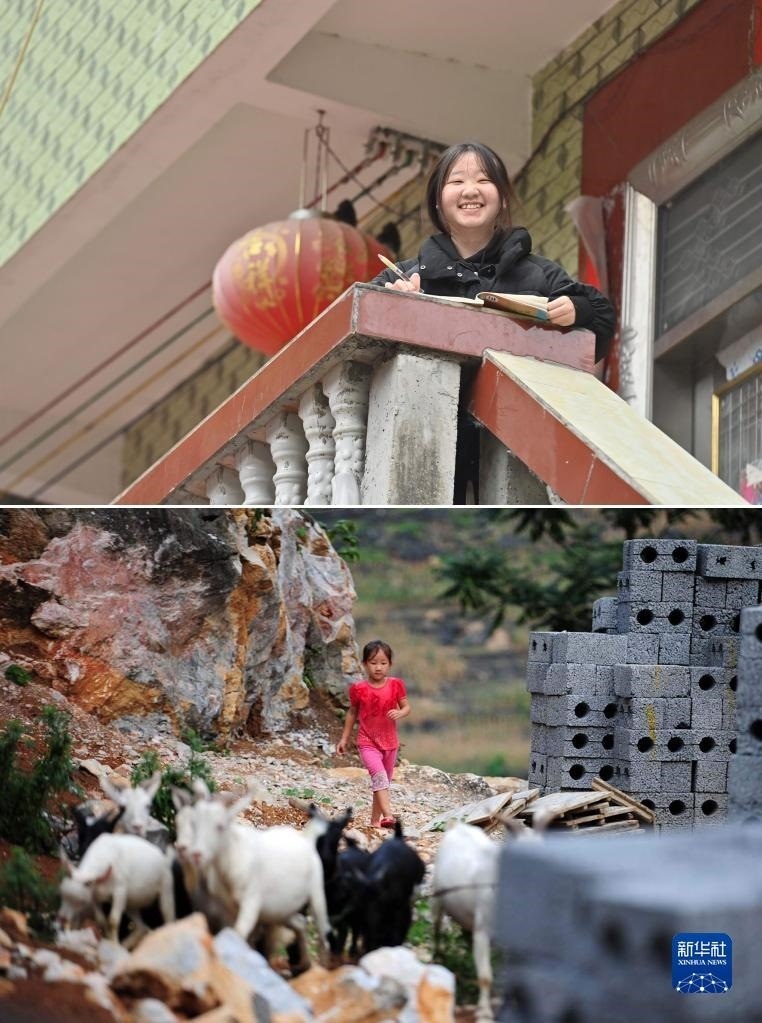 拼版照片:上圖為2023年1月16日,在大化瑤族自治縣板升鄉(xiāng)弄勇村,正在讀初中的藍(lán)秀雪在家門口學(xué)習(xí);下圖為2013年7月14日,5歲的藍(lán)秀雪在放羊。16歲的藍(lán)秀雪即將參加中考,希望能考上一所好高中。   新華社記者 黃孝邦 攝