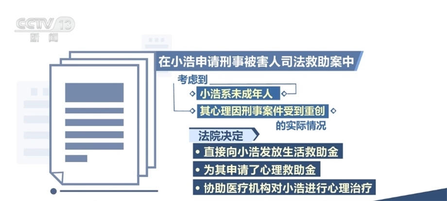 在此次發(fā)布的保護(hù)未成年人權(quán)益司法救助典型案例中,還涉及針對(duì)向未成年人提供專門心理救助金、提供心理危機(jī)干預(yù)等立體幫扶,進(jìn)一步延伸司法服務(wù)。在小浩申請(qǐng)刑事被害人司法救助案中,小浩的父親被害,其本人亦受到人身傷害,法院作出刑事附帶民事判決,判處被告人死刑,并判決其賠償附帶民事訴訟原告人經(jīng)濟(jì)損失13萬(wàn)余元。后經(jīng)調(diào)查,被告人無(wú)財(cái)產(chǎn)可供執(zhí)行。考慮到小浩系未成年人,其心理因刑事案件受到重創(chuàng)的實(shí)際情況,法院除決定直接向小浩發(fā)放生活救助金外,還為其申請(qǐng)了心理救助金,協(xié)助醫(yī)療機(jī)構(gòu)對(duì)小浩進(jìn)行心理治療。
