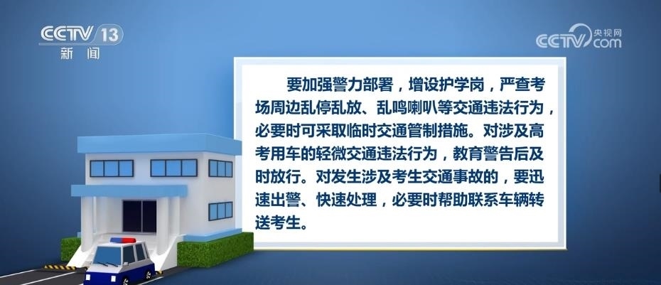 要加強(qiáng)警力部署,增設(shè)護(hù)學(xué)崗,嚴(yán)查考場周邊亂停亂放、亂鳴喇叭等交通違法行為,必要時(shí)可采取臨時(shí)交通管制措施。對涉及高考用車的輕微交通違法行為,教育警告后及時(shí)放行。對發(fā)生涉及考生交通事故的,要迅速出警、快速處理,必要時(shí)幫助聯(lián)系車輛轉(zhuǎn)送考生。