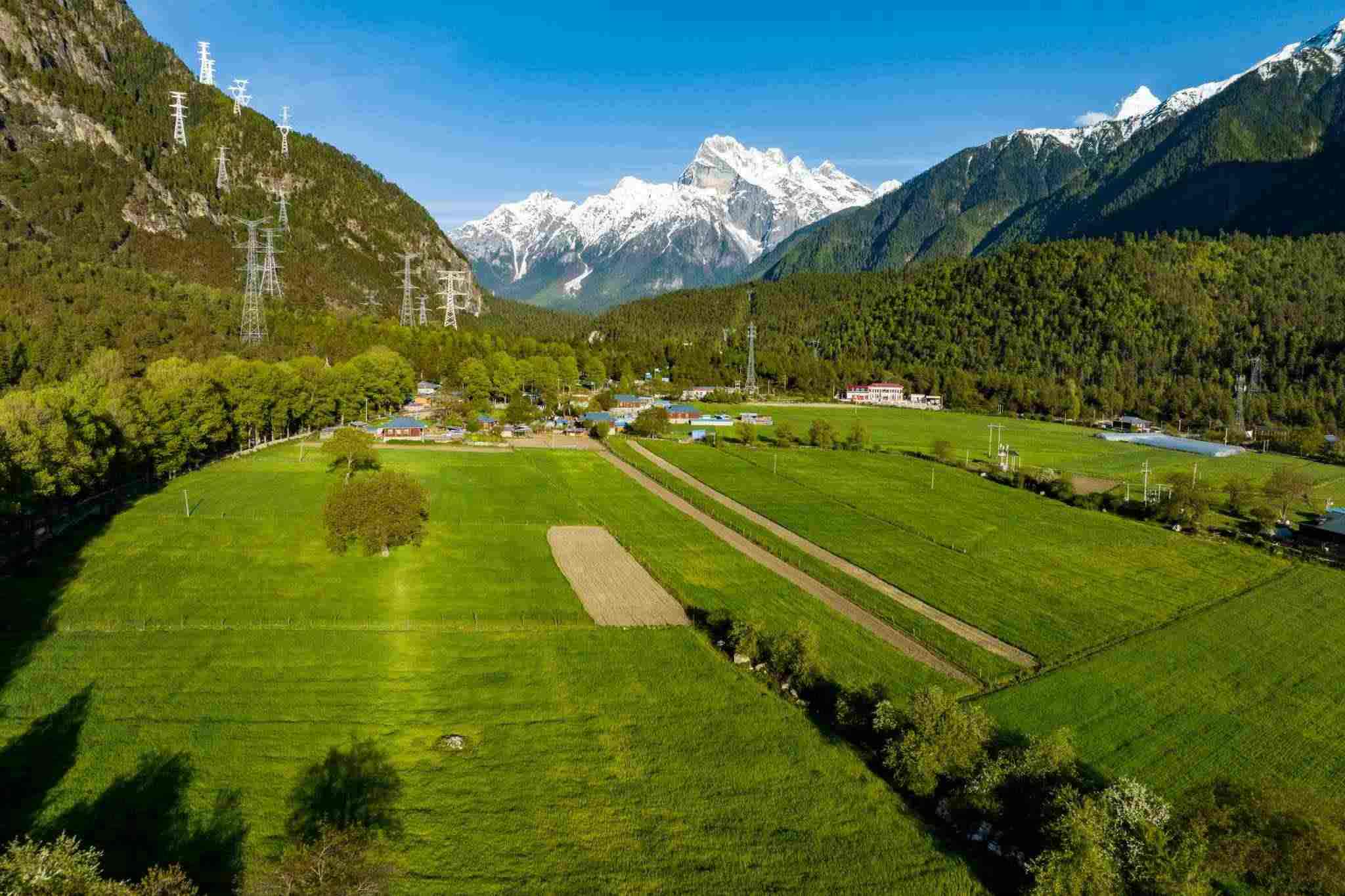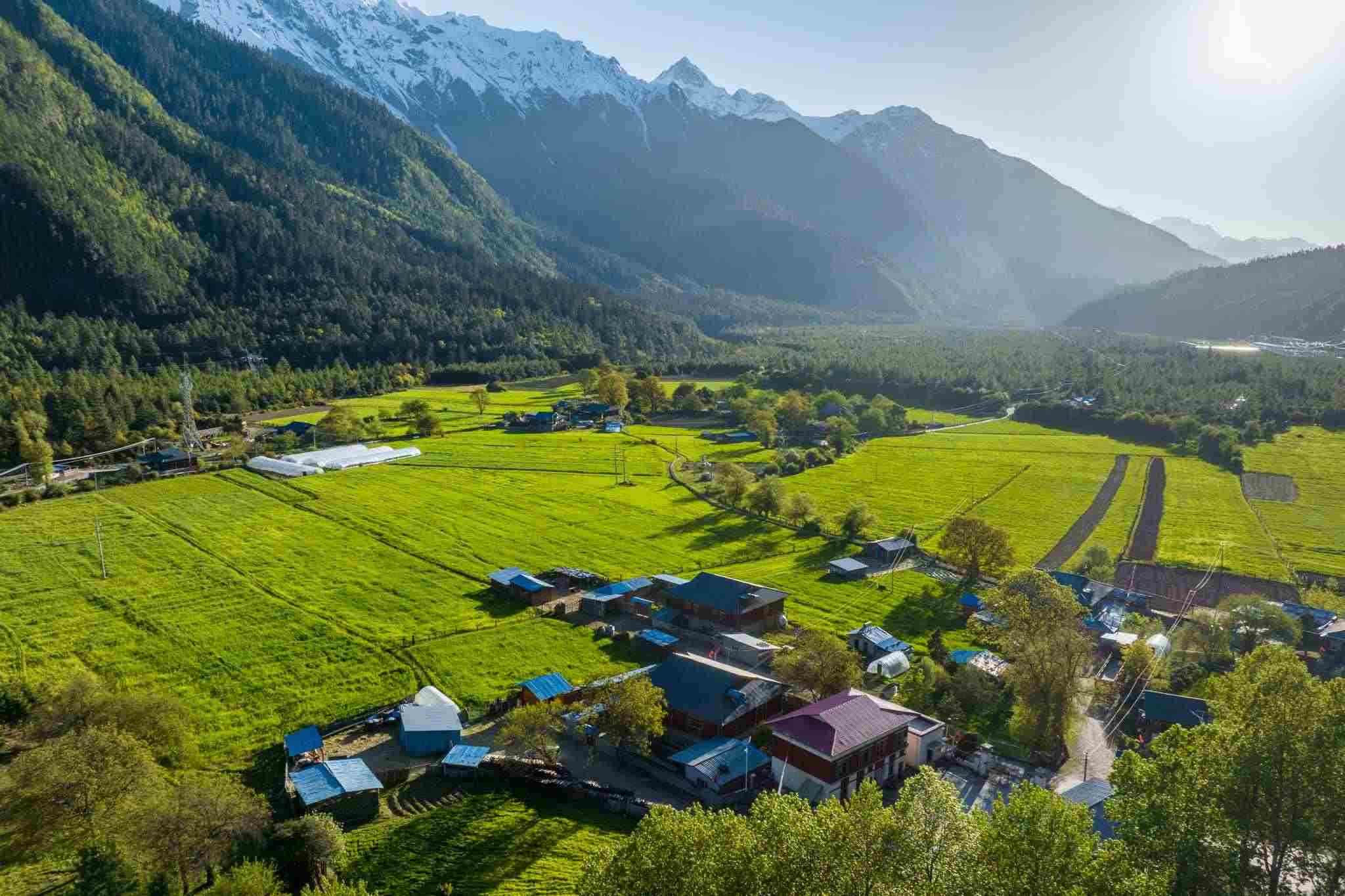 西藏林芝:村莊樹木茂密 遠處雪山巍峨