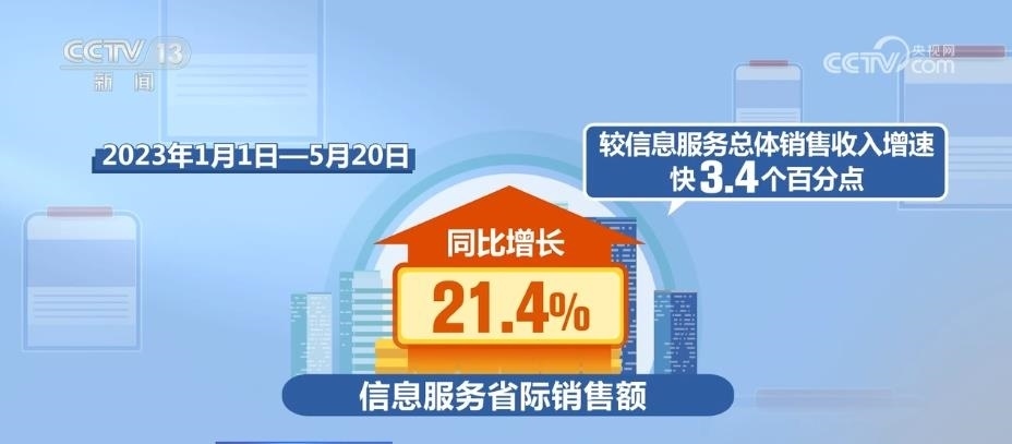 從信息方面來看,2017年—2022年,全國信息服務(wù)省際銷售額年均增長22%,較信息服務(wù)總體銷售收入增速快2.8個百分點(diǎn)。2023年1月1日—5月20日,信息服務(wù)省際銷售額同比增長21.4%,較信息服務(wù)總體銷售收入增速快3.4個百分點(diǎn)。