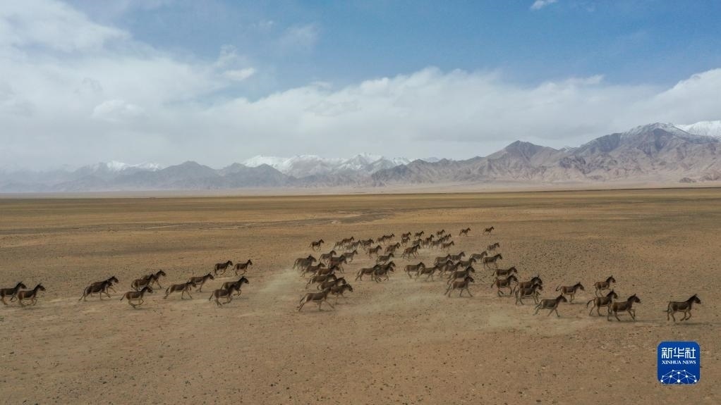 一群藏野驢在阿爾金山國(guó)家級(jí)自然保護(hù)區(qū)奔跑(5月23日攝,無(wú)人機(jī)照片)。
