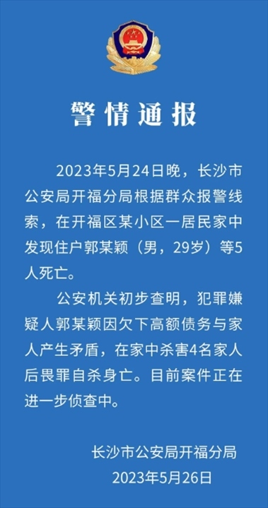 ·警方通報(bào)長沙某小區(qū)房內(nèi)發(fā)現(xiàn)5具尸體:男子殺害4名家人后畏罪自殺。