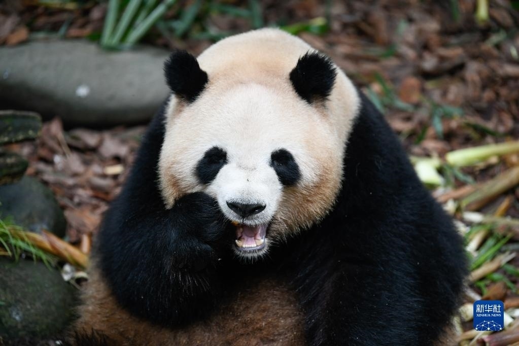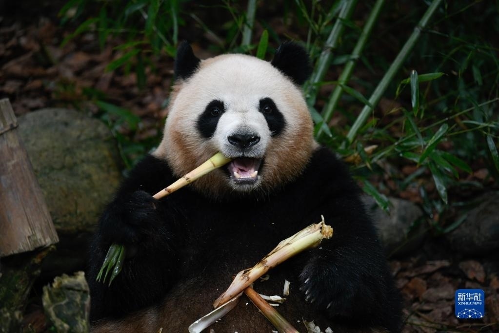 5月29日,在成都大熊貓繁育研究基地都江堰野放繁育研究中心,梅蘭在吃竹筍。   新華社記者 胥冰潔 攝