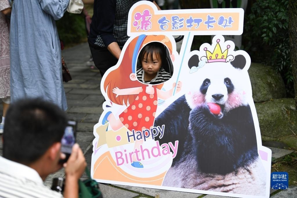 5月29日,在成都大熊貓繁育研究基地都江堰野放繁育研究中心,游客與梅蘭生日裝飾品合影留念。   新華社記者 胥冰潔 攝