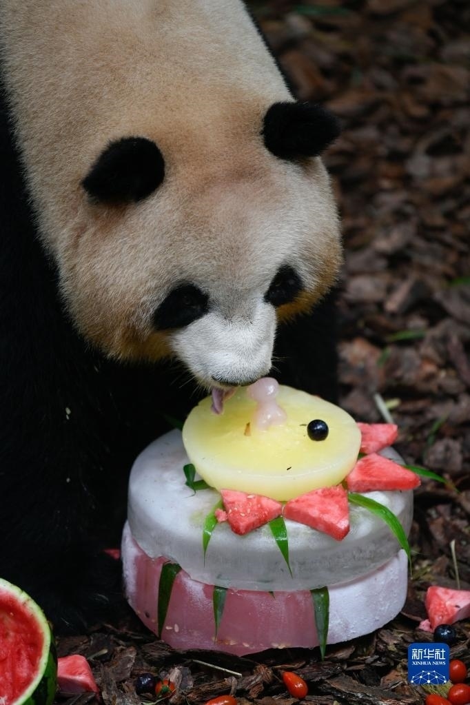 5月29日,在成都大熊貓繁育研究基地都江堰野放繁育研究中心,梅蘭在品嘗飼養(yǎng)員為它準(zhǔn)備的冰蛋糕。   新華社記者 胥冰潔 攝
