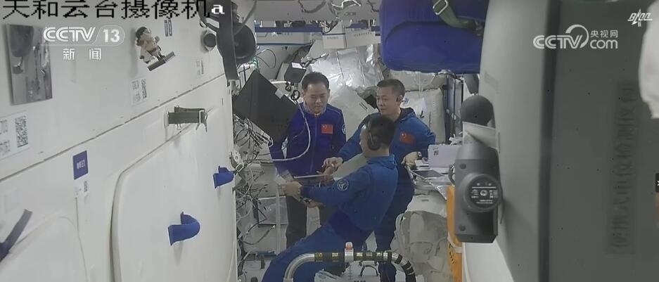 航天科技集團五院載人飛船系統(tǒng)項目技術(shù)副經(jīng)理 邵立民:他倆(兩個乘組)之間就可以在對接通道之間相互見到,也可以握手,搞個簡短的歡迎儀式,然后,神十六乘組三個(航天員)就依次能夠進(jìn)入到天和核心艙里面去。如果要真正進(jìn)到核心艙的工作區(qū)里邊,還有一個雙向承壓艙門,也就是在節(jié)點艙和空間站的生活艙之間還有一道艙門。