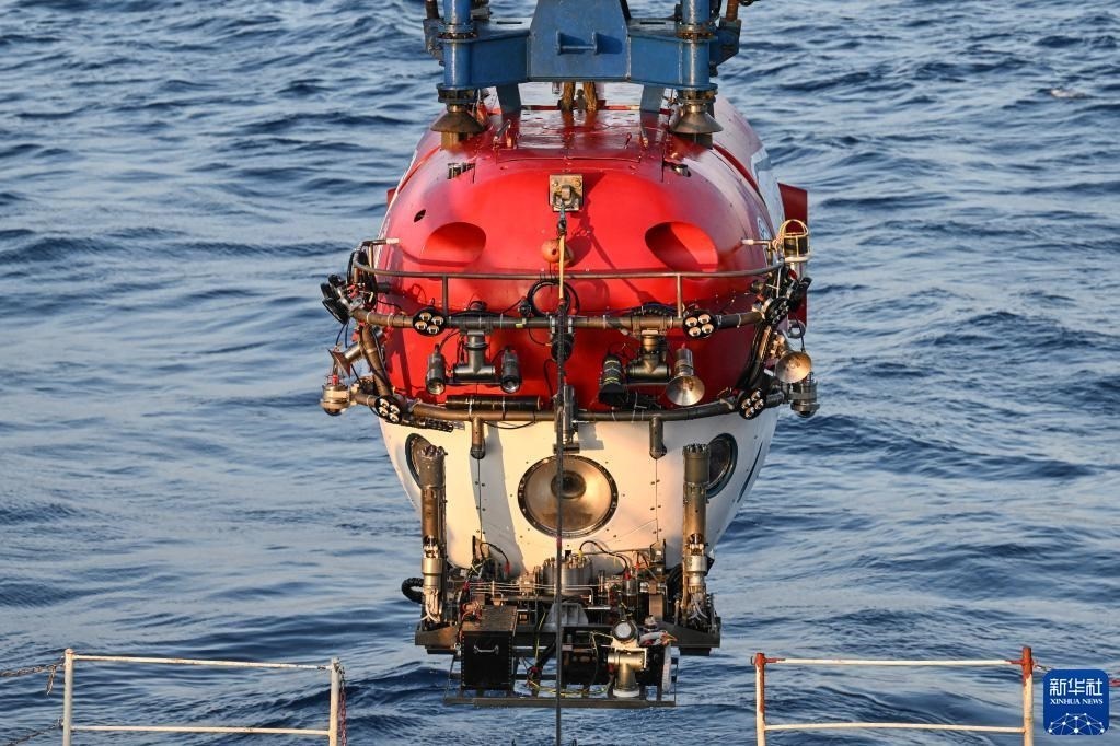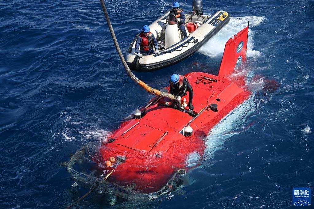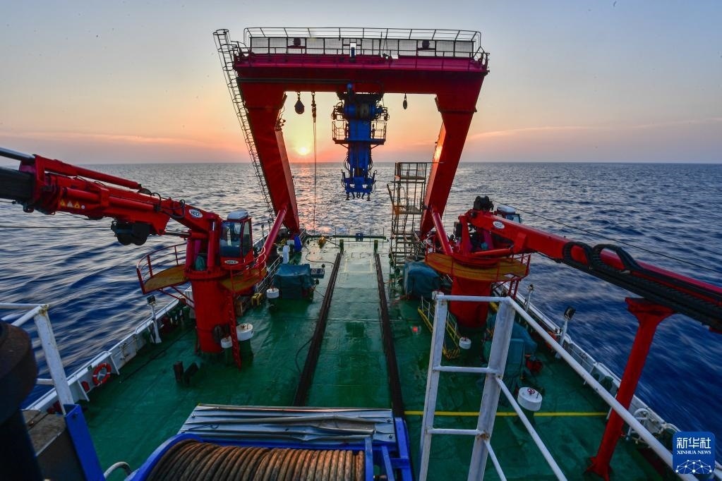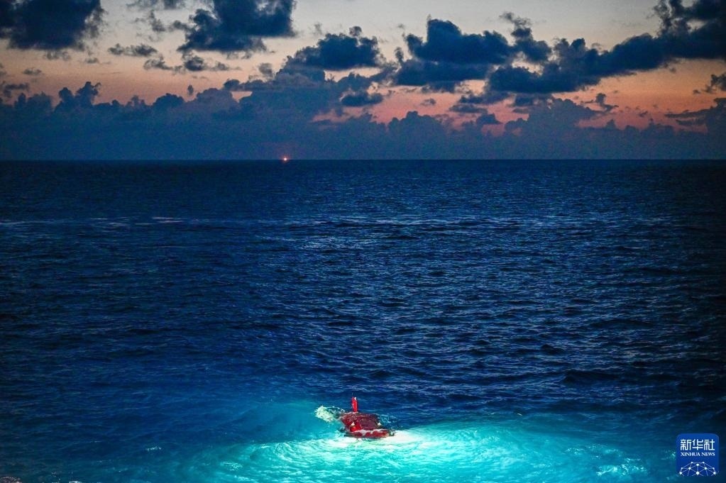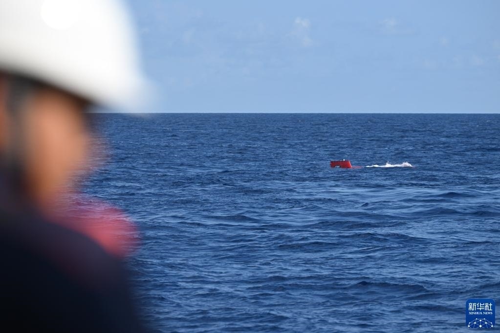 在結(jié)束當(dāng)日的水下調(diào)查后,搭載著考古隊(duì)員的“深海勇士”號載人潛水器浮出海面(5月27日攝)。   新華社記者 蒲曉旭 攝