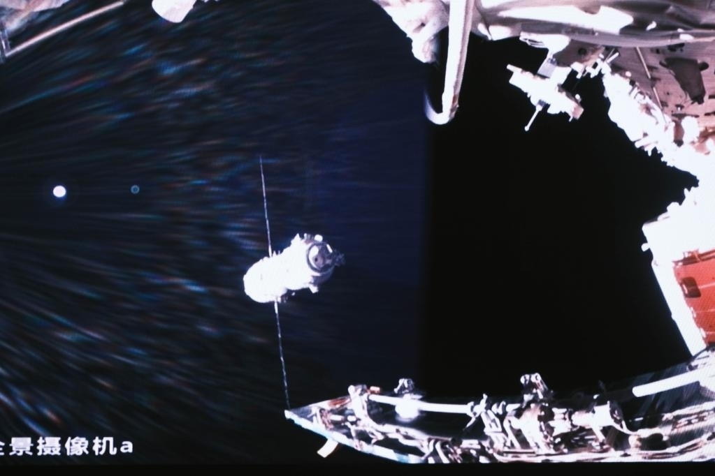 5月30日在北京航天飛行控制中心拍攝的神舟十六號載人飛船與天和核心艙進行自主快速交會對接的畫面。新華社記者 李杰 攝