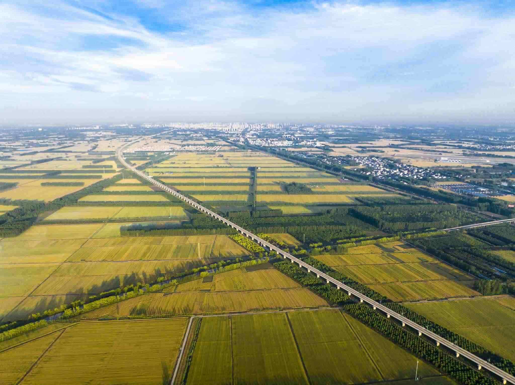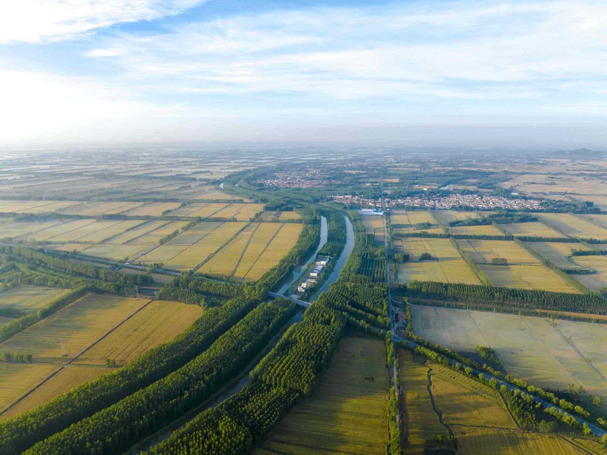 2023年6月3日,江蘇連云港,東海縣,金色田野與村莊、道路、河流共同構(gòu)成了一幅秀美的夏日豐收畫卷。視覺(jué)中國(guó)