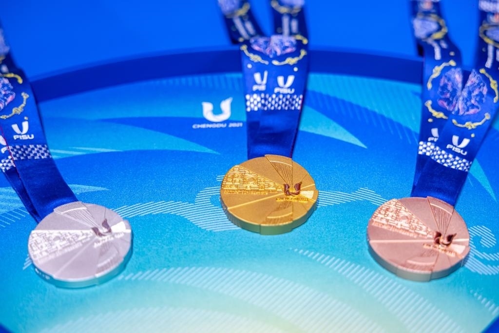 獎(jiǎng)牌是每個(gè)體育賽事的重要組成部分之一,本屆大運(yùn)會(huì)獎(jiǎng)牌根據(jù)國(guó)際大體聯(lián)要求,融合成都和國(guó)際化傳播元素,最終形成了大運(yùn)會(huì)獎(jiǎng)牌“蓉光”。獎(jiǎng)牌整體設(shè)計(jì)以成都大運(yùn)會(huì)會(huì)徽和太陽(yáng)神鳥為主要靈感,利用幾何扇面代表太陽(yáng)光芒,傳遞了太陽(yáng)神鳥守護(hù)夢(mèng)想的設(shè)計(jì)概念。獎(jiǎng)牌以“蓉光”為名,諧音為“榮光”,寓意榮耀、光彩,寄托了對(duì)大運(yùn)健兒在成都青春展翅、乘夢(mèng)而行的美好期許。