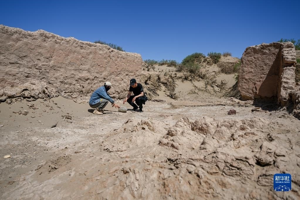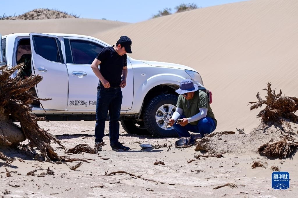 6月2日,額濟(jì)納旗文物保護(hù)中心工作人員在居延遺址附近查看散落的石碾。   新華社記者 連振 攝