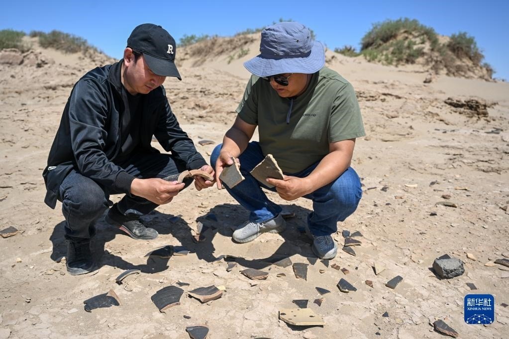 6月2日,額濟(jì)納旗文物保護(hù)中心工作人員在居延遺址附近查看散落的陶片。   新華社記者 連振 攝