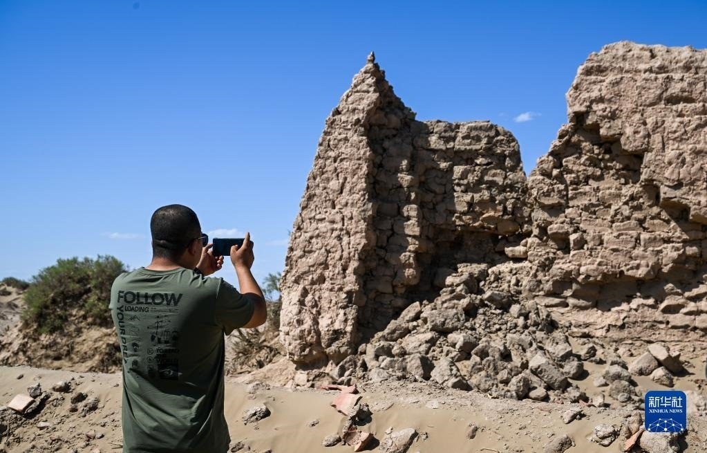 6月2日,額濟(jì)納旗文物保護(hù)中心工作人員拍攝紅廟遺址坍塌情況。   新華社記者 連振 攝