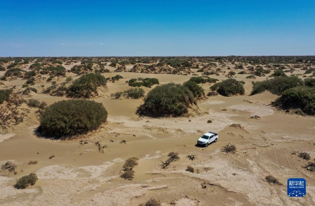 6月2日,額濟(jì)納旗文物保護(hù)中心工作人員在戈壁灘上巡護(hù)(無人機(jī)照片)。   新華社記者 連振 攝