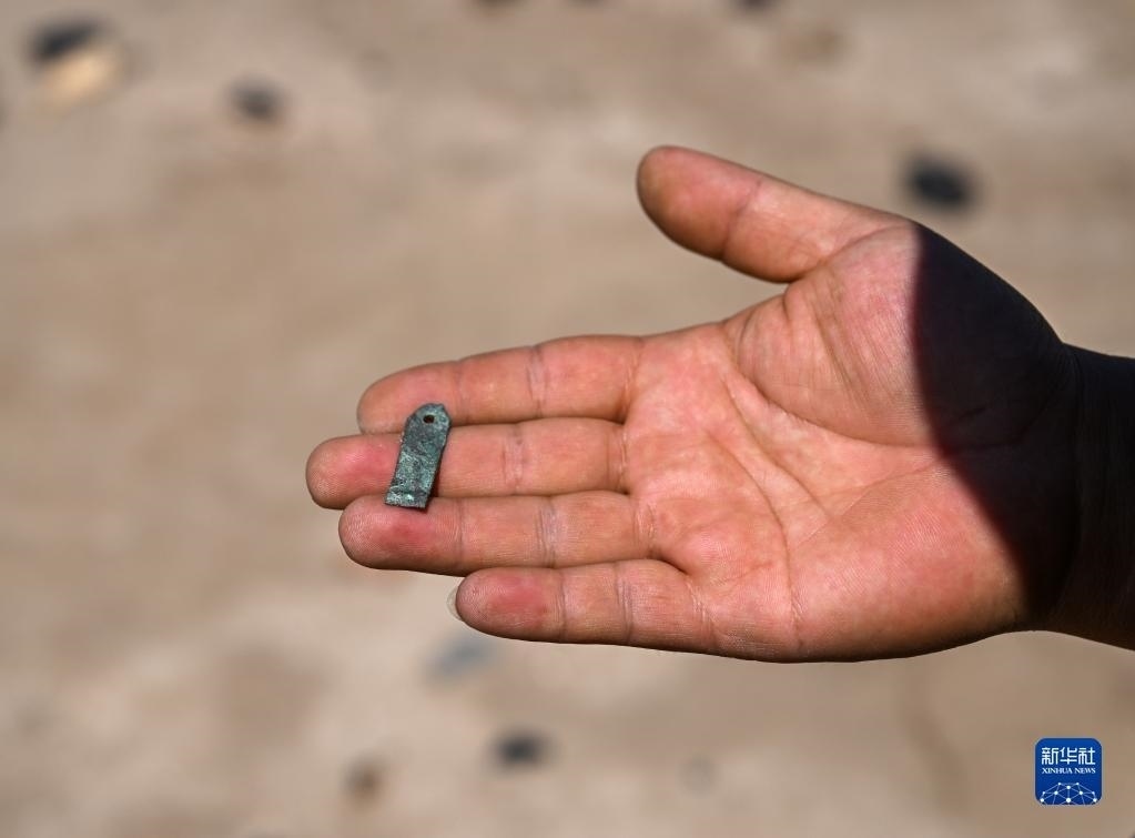 這是額濟(jì)納旗文物保護(hù)中心工作人員在巡護(hù)中發(fā)現(xiàn)的銅片(6月2日攝)。   新華社記者 連振 攝