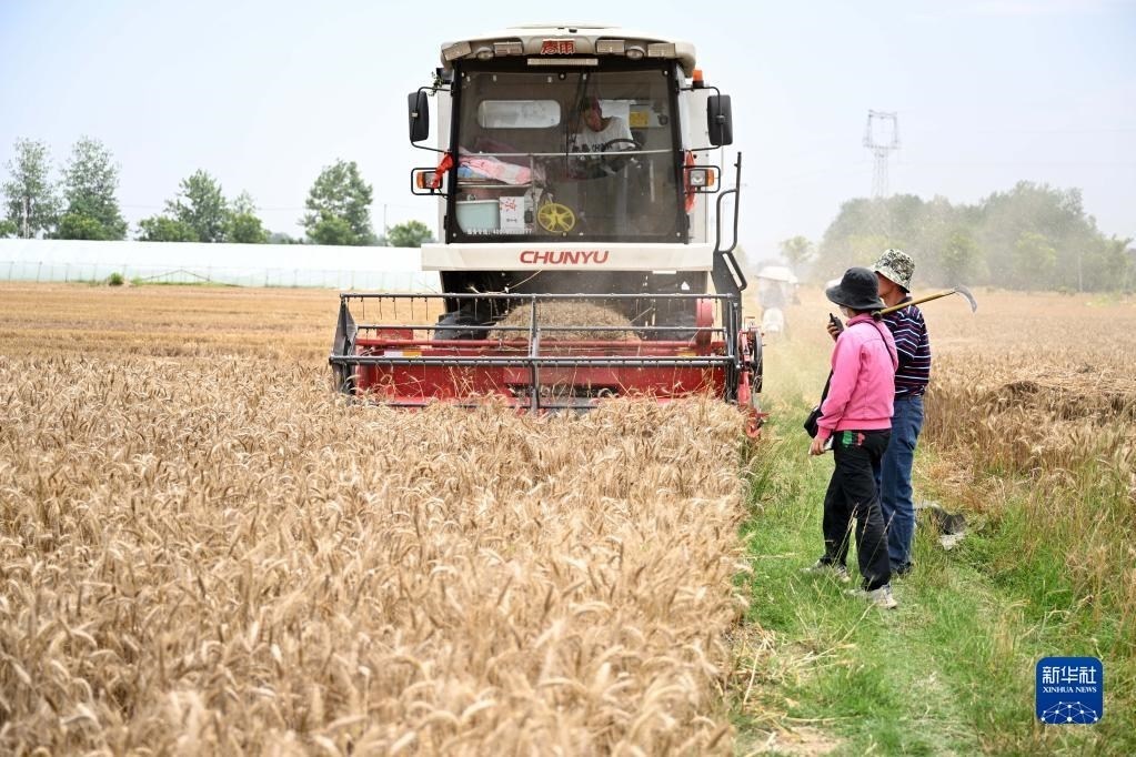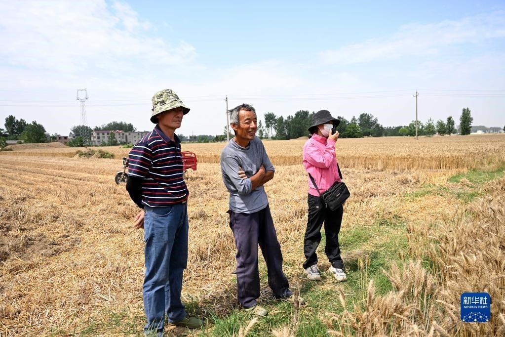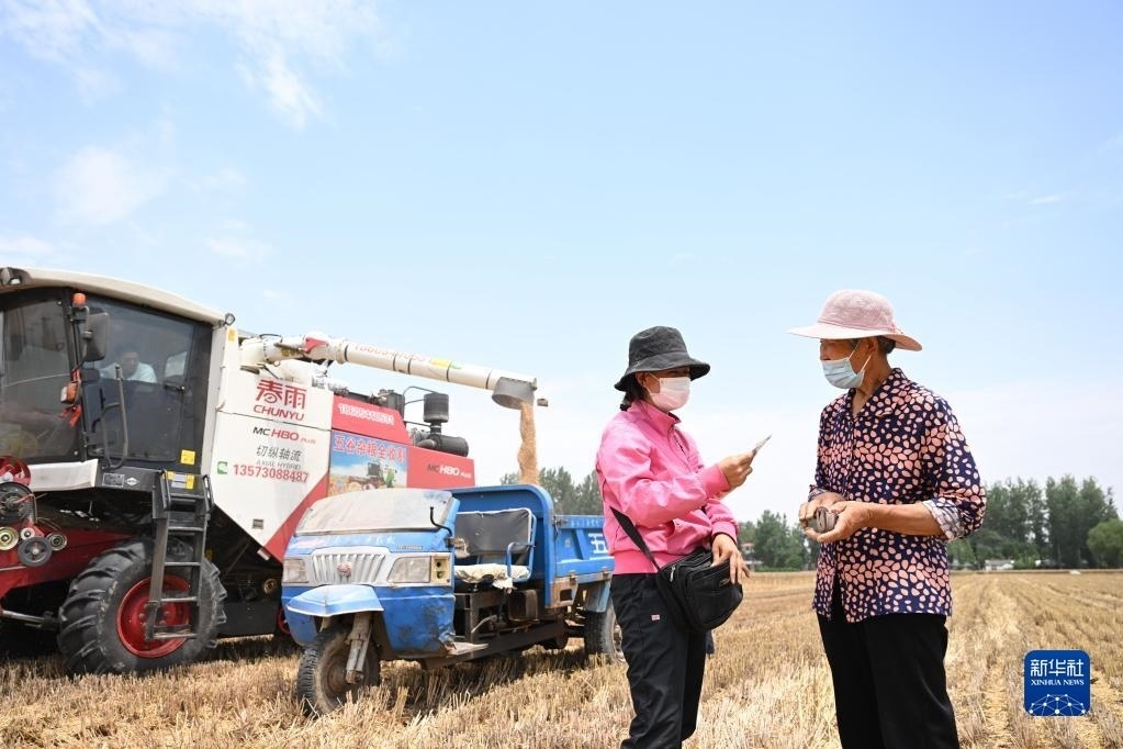 6月2日,在安徽省阜陽市阜南縣許堂鄉(xiāng)劉崗村,陳麗娟和村民確認(rèn)收割費用。