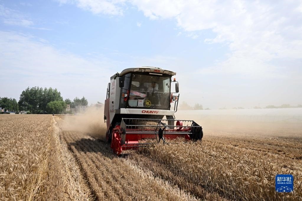 6月2日,在安徽省阜陽市阜南縣許堂鄉(xiāng)劉崗村,董斐斐駕駛收割機為村民收割小麥。