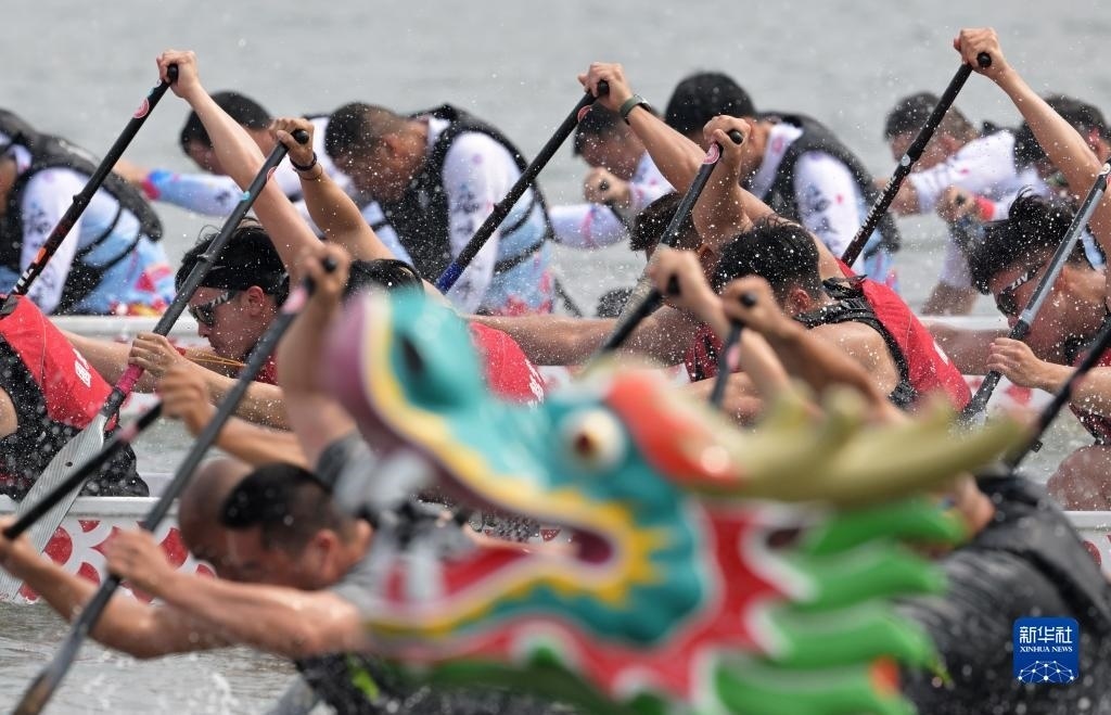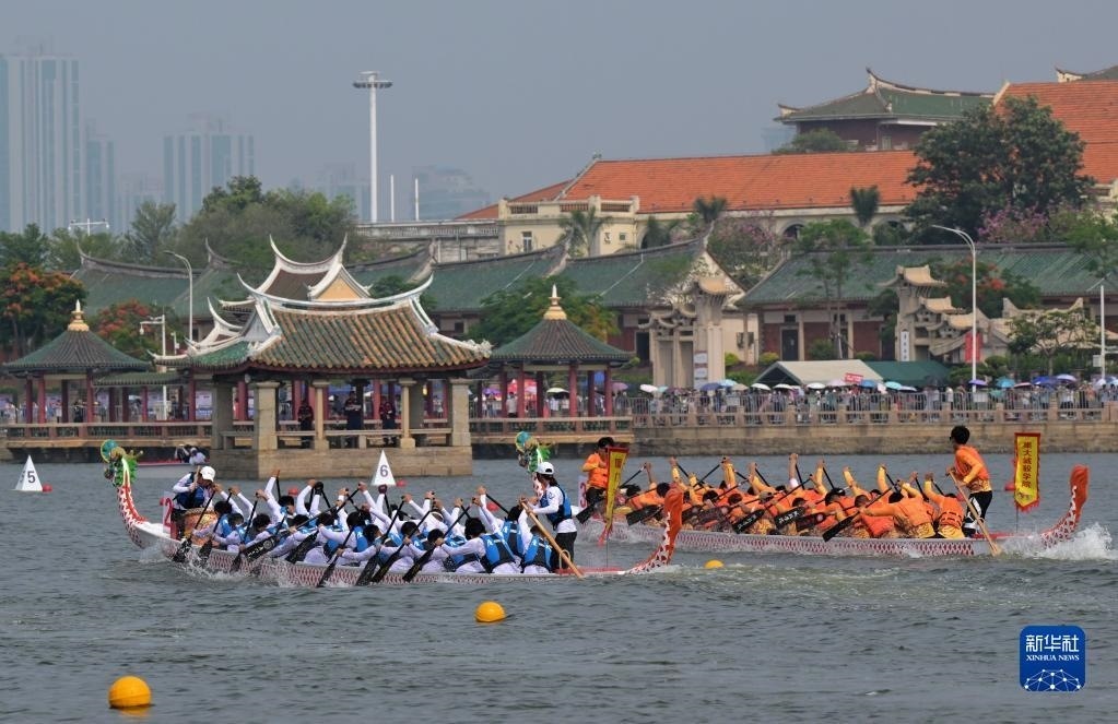 6月3日,在福建廈門(mén)集美龍舟池,來(lái)自海峽兩岸的龍舟隊(duì)競(jìng)渡爭(zhēng)先。