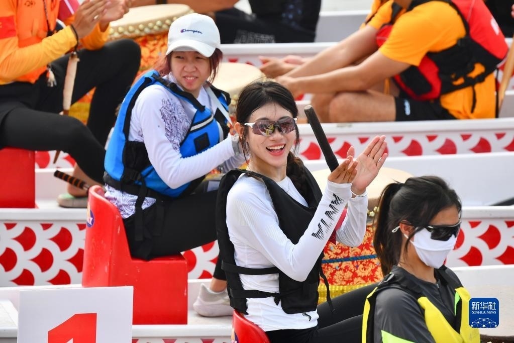 6月3日,參賽龍舟隊(duì)鼓手為海峽兩岸龍舟賽開(kāi)幕儀式的舞臺(tái)演出鼓掌。