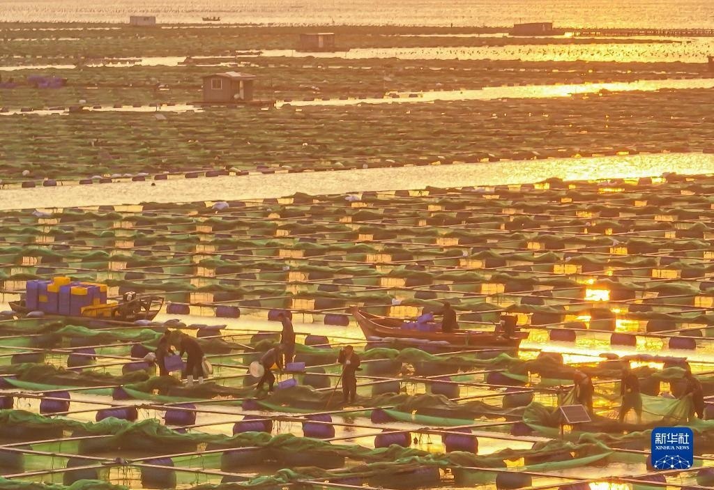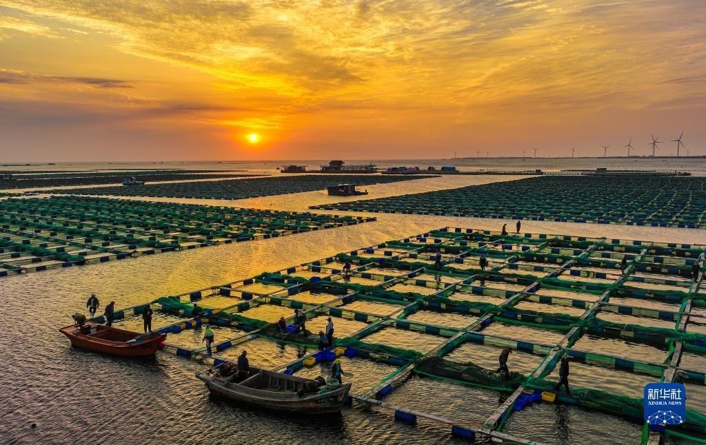 6月5日,在榮成市石島管理區(qū)桑溝灣海洋牧場生態(tài)網(wǎng)箱養(yǎng)殖區(qū),漁民在進(jìn)行海上養(yǎng)殖作業(yè)(無人機(jī)照片)。