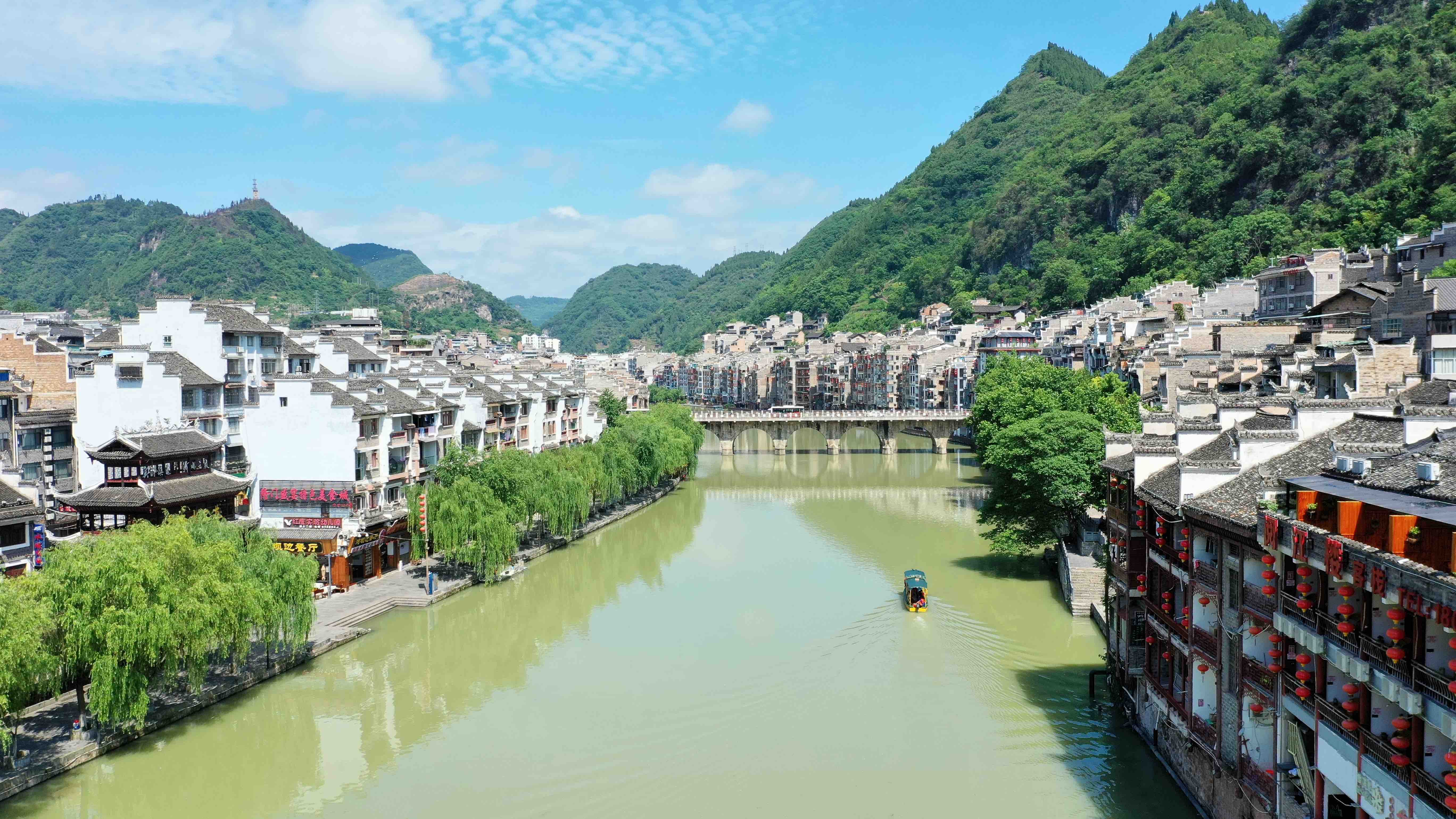 舞陽(yáng)河全長(zhǎng)約400公里,流經(jīng)貴州省鎮(zhèn)遠(yuǎn)境內(nèi)93.7公里,自西向東呈“S”型穿城而過(guò),行成了“九山抱一水,一水分兩城”的獨(dú)特“太極古城”風(fēng)貌,大自然的鬼斧神工描繪了一幅精美絕倫的畫(huà)卷。(寧堅(jiān) 吳昌臣)