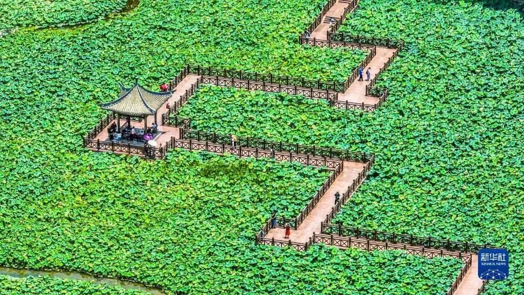 6月10日,游人在南寧市南湖之濱荷花池參觀游覽(無(wú)人機(jī)照片)。