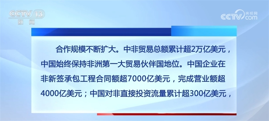 合作規(guī)模不斷擴大。中非貿(mào)易總額累計超2萬億美元,中國始終保持非洲第一大貿(mào)易伙伴國地位。中國企業(yè)在非新簽承包工程合同額超7000億美元,完成營業(yè)額超4000億美元;中國對非直接投資流量累計超300億美元,已成為非洲第四大投資來源國;向非洲國家派遣醫(yī)療隊員約9000人次,提供研修培訓名額超過10萬個,一批基礎(chǔ)設(shè)施和社會民生項目相繼建成。