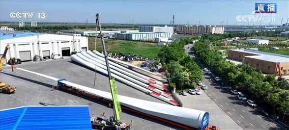 總臺央視記者 古峻嶺:現在準備工作已經就緒,車輛緩緩啟動,工作人員告訴我,3支123米的超長葉片從生產它的廠里出發(fā)后,將前往30公里外的連云港碼頭,預計將于15日左右通過海運送達福建平潭外海的海上風電場進行整機安裝。