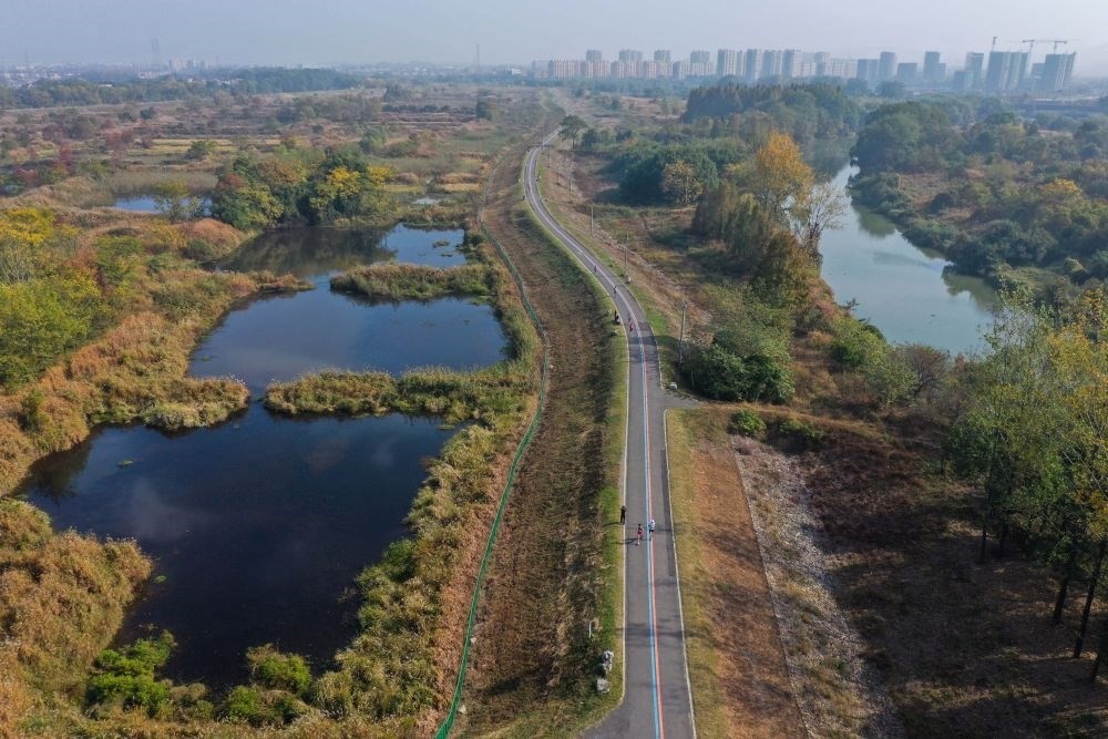 2022年11月12日,運動愛好者們在浙江省杭州市余杭區(qū)瓶窯鎮(zhèn)北湖草蕩生態(tài)濕地的健身游步道上參加健康跑比賽(無人機照片)。新華社記者 徐昱 攝
