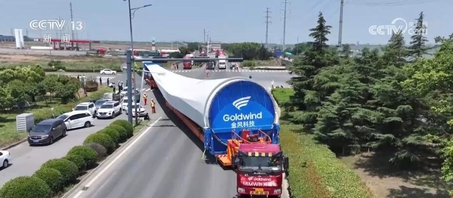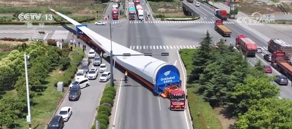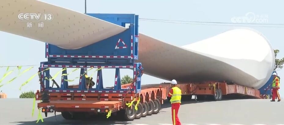 央視網(wǎng)消息:今天(6月14日)上午,100%我國(guó)自主知識(shí)產(chǎn)權(quán)的123米超長(zhǎng)海上風(fēng)電葉片在江蘇連云港啟動(dòng)陸地轉(zhuǎn)運(yùn)工作。上午9時(shí),代表著我國(guó)風(fēng)電裝備最新技術(shù)水準(zhǔn)的大葉片,從廠區(qū)到港口碼頭,陸地運(yùn)輸全程約30公里,耗時(shí)約3到4個(gè)小時(shí),其中運(yùn)輸大葉片的車輛還要拐過(guò)90度的直角彎。如此大體量的裝備運(yùn)輸是一個(gè)復(fù)雜的過(guò)程,其中有哪些技術(shù)難點(diǎn)?來(lái)看記者今天上午從現(xiàn)場(chǎng)發(fā)回的報(bào)道。