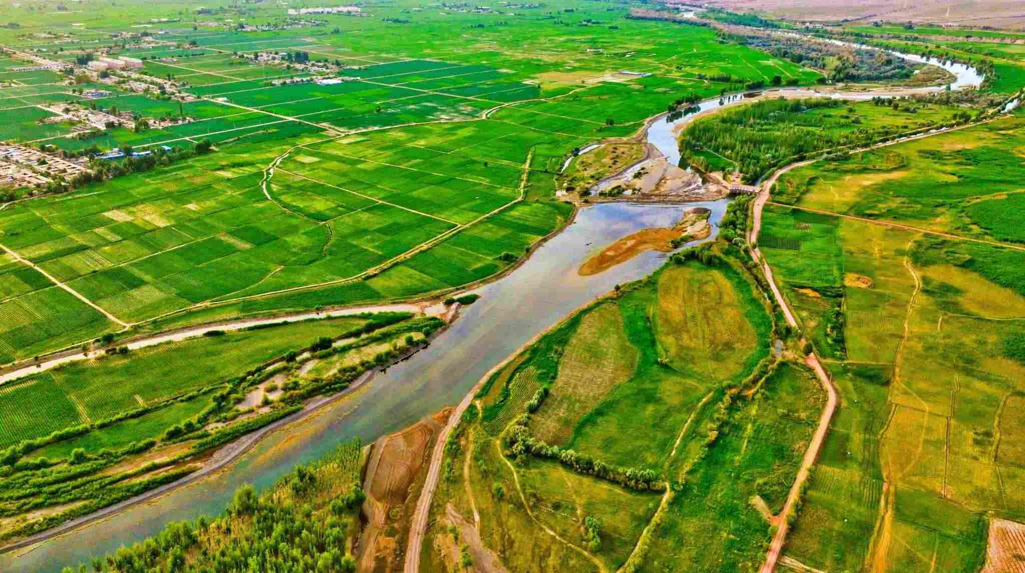 2023年6月15日,甘肅省張掖市,甘州區(qū)靖安鄉(xiāng)、臨澤縣板橋鎮(zhèn)境內(nèi)的黑河兩岸,寬闊的河床、彎曲的河流、農(nóng)作物以及樹(shù)木、蘆葦、濕地在夕陽(yáng)的映照下綠意盎然。視覺(jué)中國(guó)