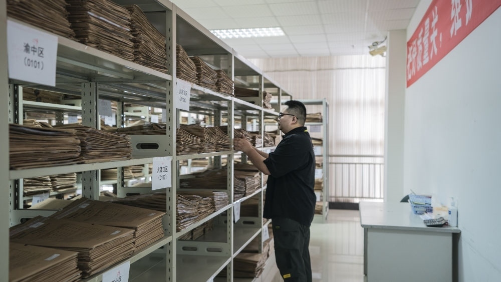 6月13日,在西南大學評卷點,工作人員將完成掃描后的高考答卷及答題卡裝入檔案袋集中管理。新華社記者李前磊 攝