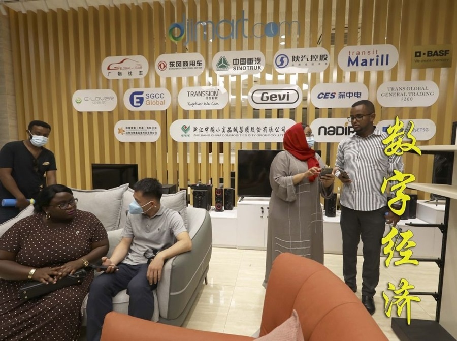 烏干達(dá)青年企業(yè)家迪莉婭(前左)在吉布提國(guó)際自貿(mào)區(qū)跨境電商平臺(tái)展示區(qū)與中方人員交流(2022年9月14日攝)。