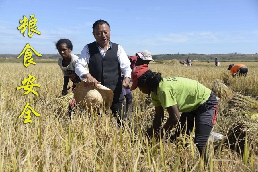 在馬達(dá)加斯加首都塔那那利佛附近的馬義奇鎮(zhèn),中國(guó)雜交水稻技術(shù)專家胡月舫(左二)在中國(guó)國(guó)家雜交水稻工程技術(shù)研究中心非洲分中心的試驗(yàn)田里和當(dāng)?shù)剞r(nóng)民交流(2023年5月12日攝)。目前,中國(guó)雜交水稻在馬達(dá)加斯加累計(jì)推廣面積已達(dá)5萬多公頃,平均每公頃產(chǎn)量可達(dá)7.5噸左右。馬達(dá)加斯加距離實(shí)現(xiàn)糧食自給自足的目標(biāo)邁近了一大步。