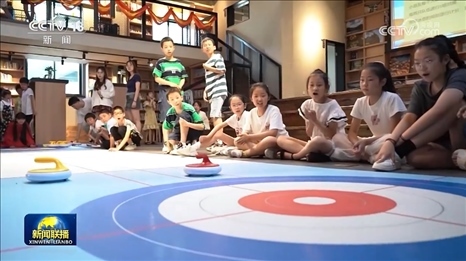 在紹興竹田頭村,偏遠(yuǎn)村落的孩子們正在新建的農(nóng)家書屋里體驗(yàn)冰壺課。