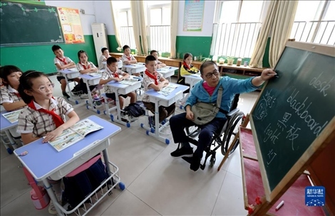 今年48歲的楊季剛是山東省棗莊市永安鎮(zhèn)遺棠小學(xué)一名鄉(xiāng)村教師,從教已28年。2017年初,楊季剛因意外摔成重傷,終生將與輪椅為伴??恐B強(qiáng)的毅力,歷經(jīng)康復(fù)訓(xùn)練的艱辛,2018年秋季楊季剛?cè)缙诨氐搅诵@,在特制1米高的小黑板上頑強(qiáng)地續(xù)寫他的教師生涯。