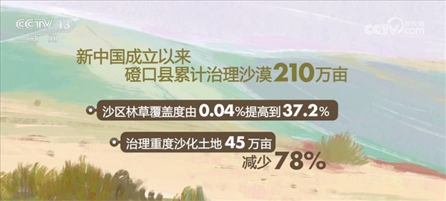 數(shù)據(jù)顯示,新中國(guó)成立以來(lái),磴口縣累計(jì)治理沙漠210萬(wàn)畝,沙區(qū)林草覆蓋度由0.04%提高到37.2%,治理重度沙化土地45萬(wàn)畝,減少78%,向黃河年輸沙量減少到370萬(wàn)噸,降低94.7%,沙漠治理呈現(xiàn)出“整體好轉(zhuǎn)、改善加速”的良好態(tài)勢(shì),也因此形成了防沙治沙“磴口模式”。