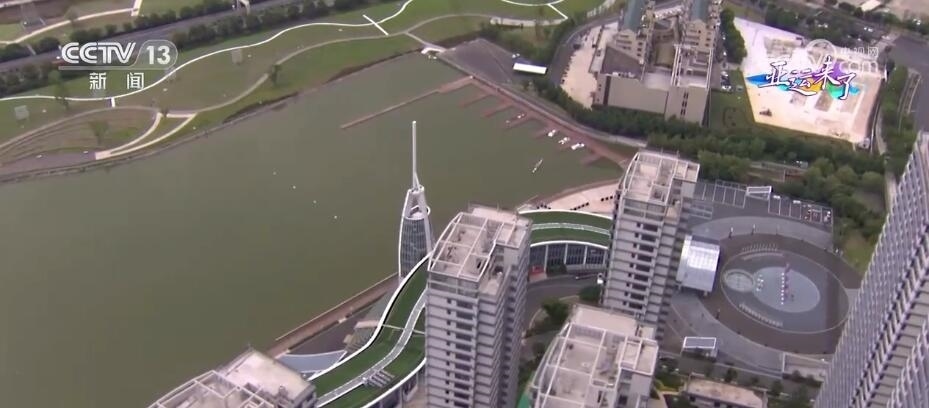總臺記者 梁燁:但是要說溫州什么運動最熱鬧,那就肯定是龍舟了。我們現(xiàn)在看到的是溫州龍舟運動中心,這里是全亞洲最高標準的龍舟賽場。我們從空中俯瞰,整棟樓看起來非常狹長,并且高低起伏猶如山脈,就好像是一條龍靜臥在水面之上,因此,這幢樓也被稱為“龍樓”。比賽時,這里主要作賽事保障用途。緊挨著龍樓的這座,從正面看像是船槳,從側面看像龍舟的建筑就是舟塔,這也是比賽的終點塔。比賽期間,裁判員們就會在這里觀看比賽,在這里計時計分。此時此刻,我們看到水面上正在進行演練,他們所劃行的這1200米的賽道到時候就是龍舟的比賽場地。