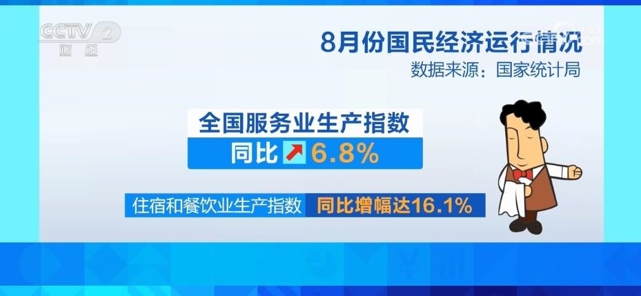 服務業(yè)較快增長,8月份,全國服務業(yè)生產(chǎn)指數(shù)同比增長6.8%。其中,住宿和餐飲業(yè)依然保持較快增長,生產(chǎn)指數(shù)同比增幅達到16.1%。