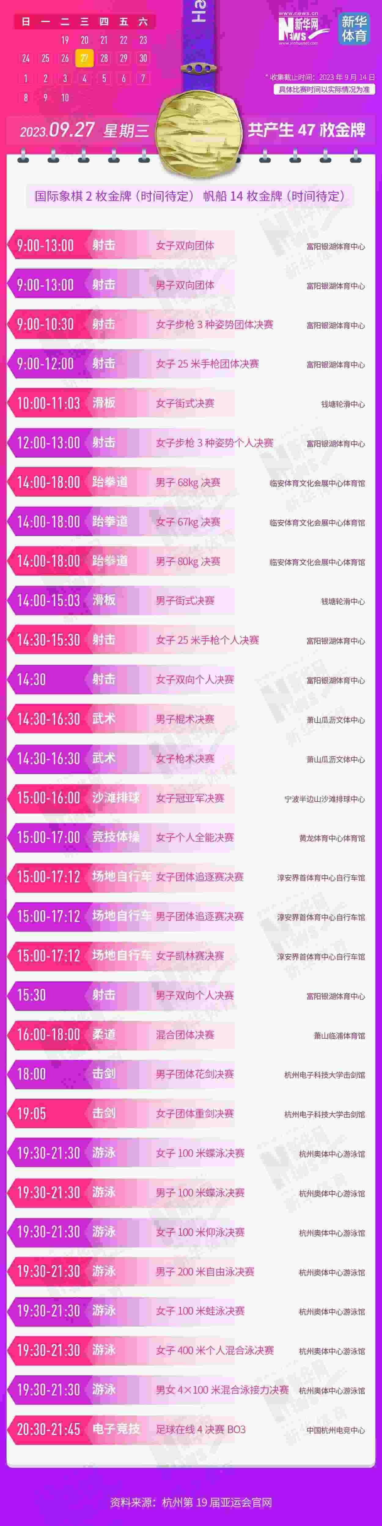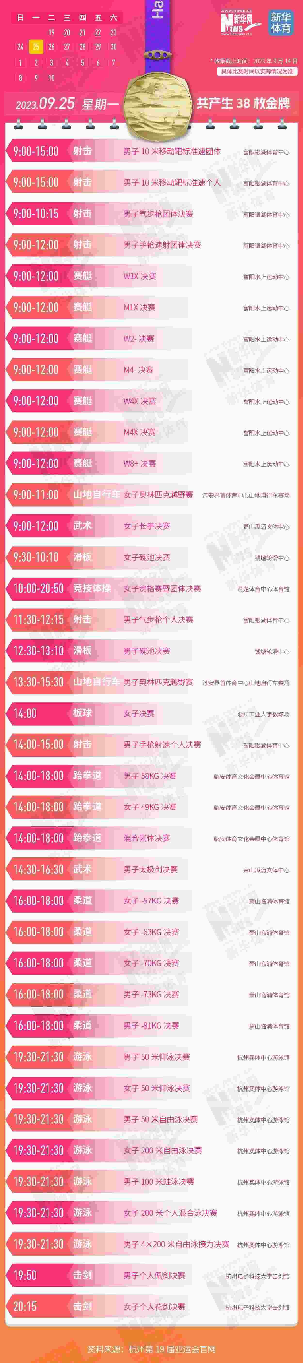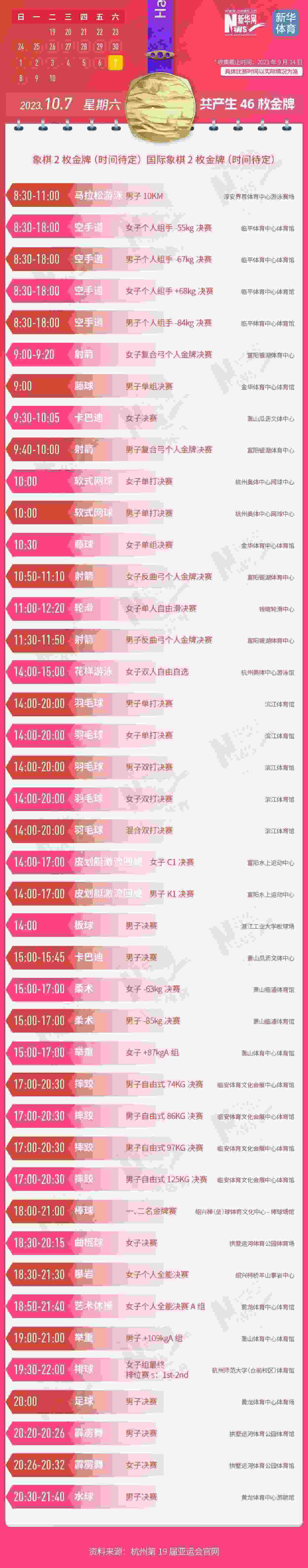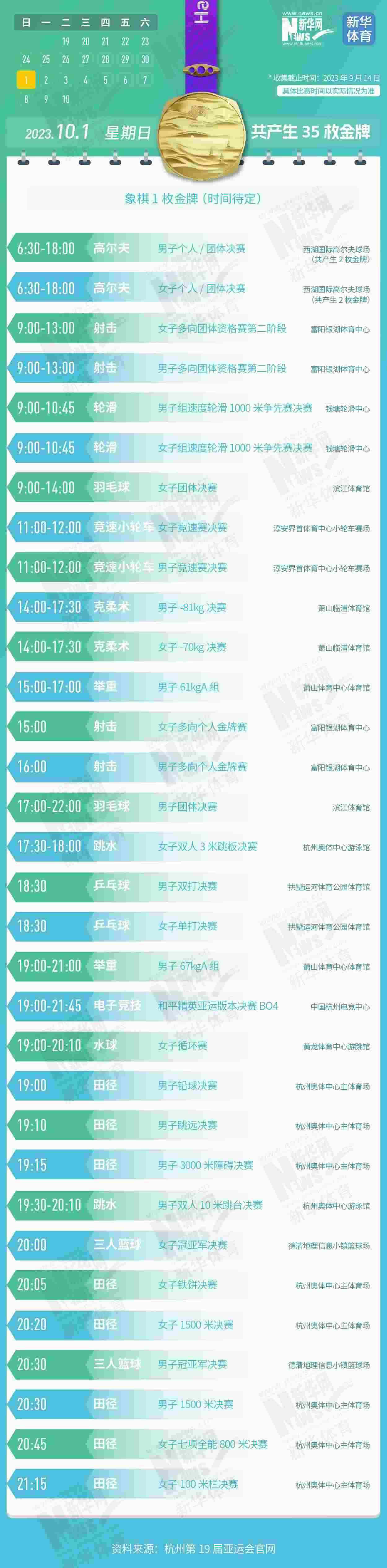 杭州第19屆亞運會即將開幕。本屆亞運會將產(chǎn)生481枚金牌,快收藏這份金牌賽事日歷,助你精準(zhǔn)觀賽!