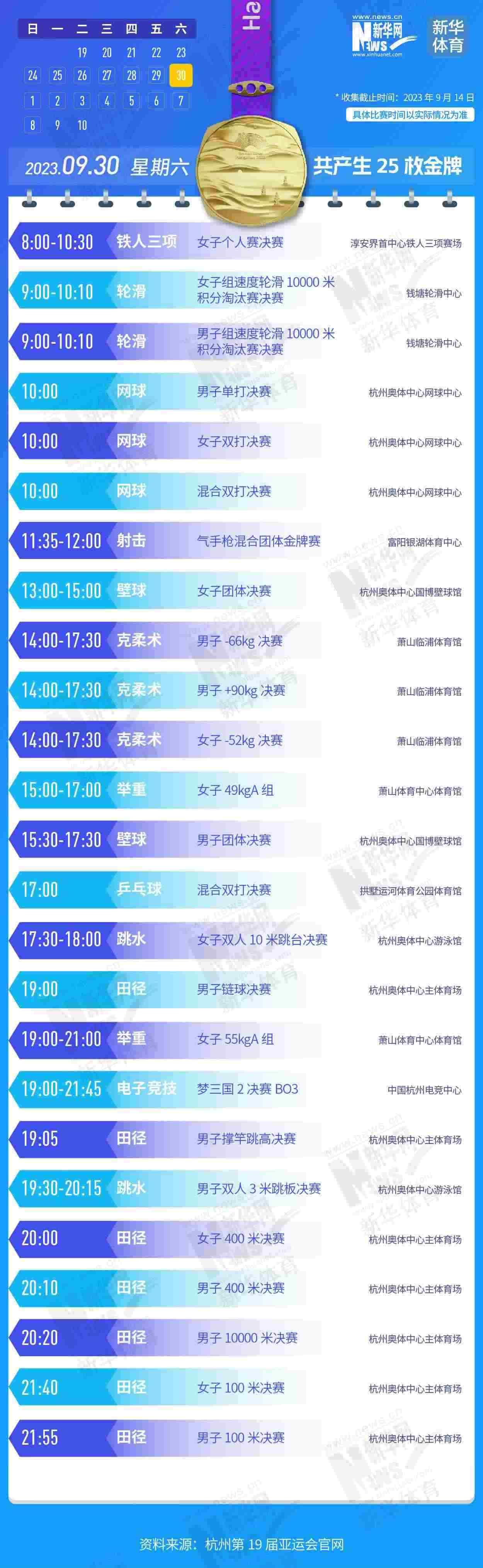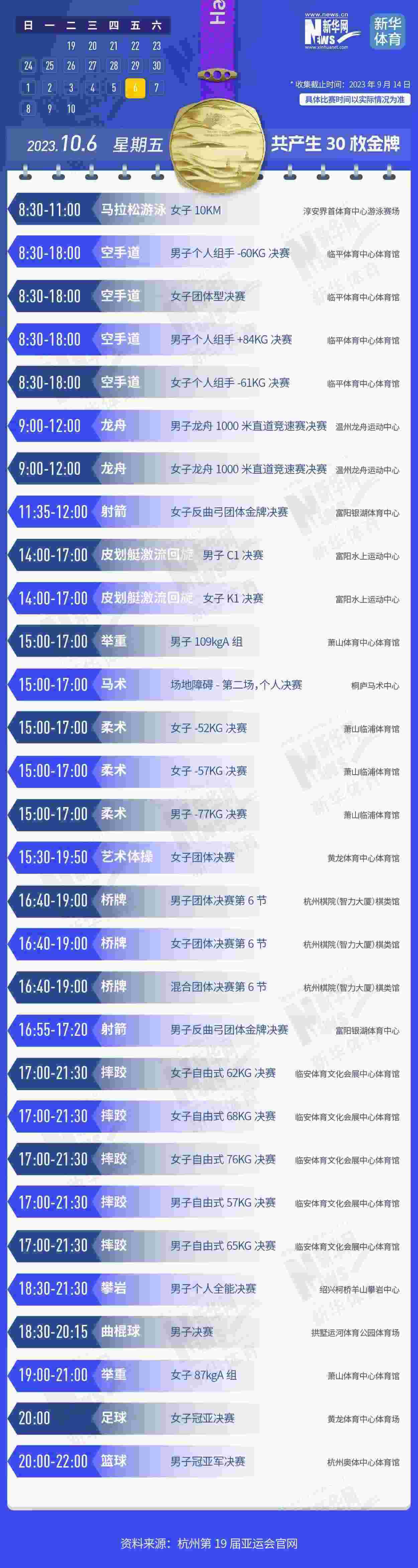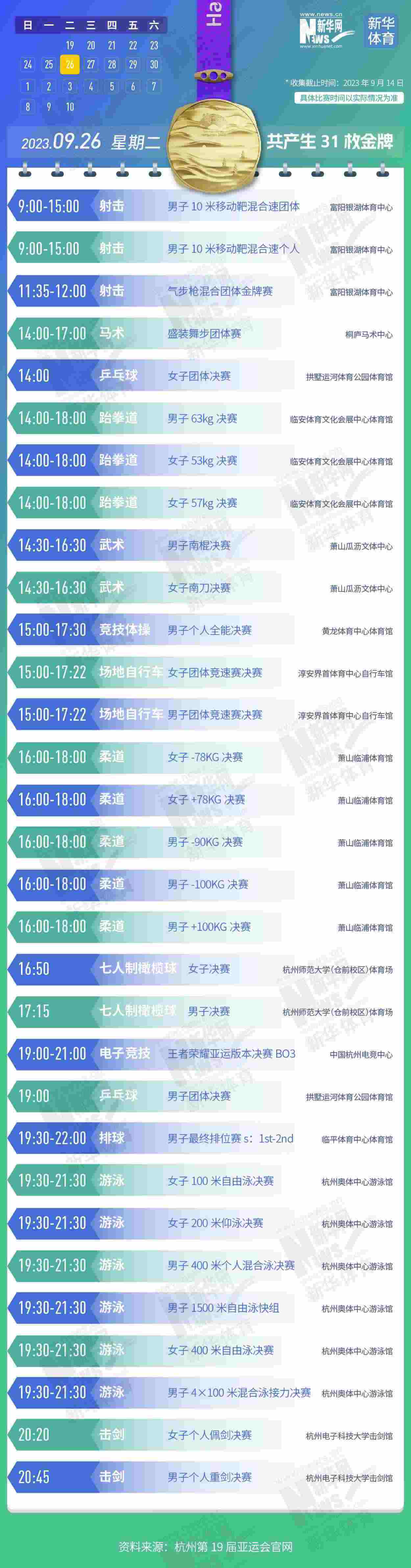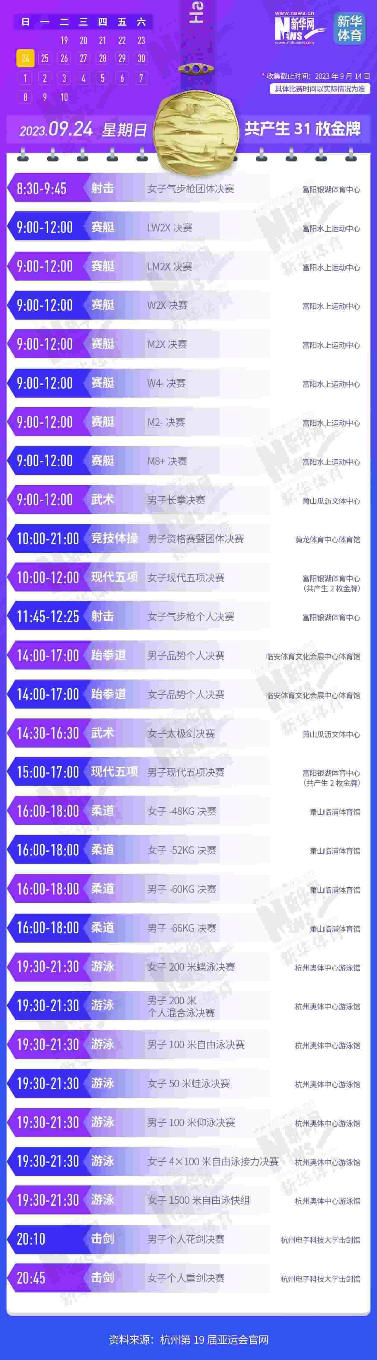 杭州第19屆亞運會即將開幕。本屆亞運會將產(chǎn)生481枚金牌,快收藏這份金牌賽事日歷,助你精準(zhǔn)觀賽!