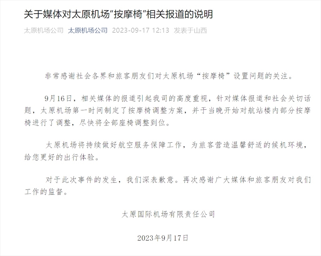 ·太原機場回應“部分登機口全是按摩椅”:將在19日調(diào)整完畢。