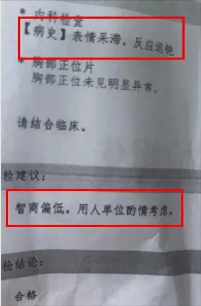 ·江蘇一醫(yī)院體檢報告上寫“智商偏低,用人單位酌情考慮”?涉事醫(yī)院回應:屬實,主檢醫(yī)生已被停職。