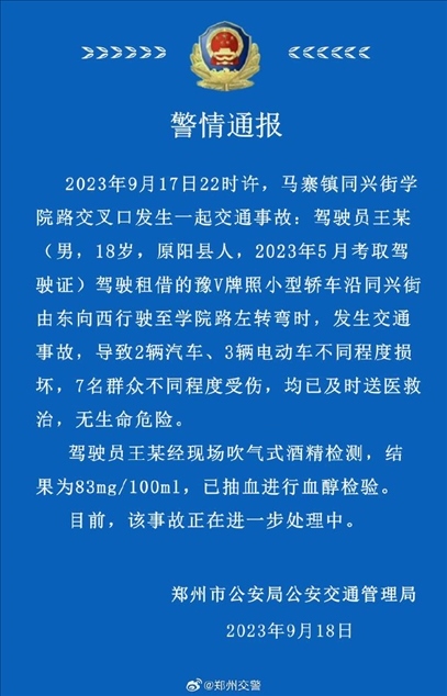 ·鄭州警方通報(bào)18歲男子醉駕致7人傷,肇事者剛領(lǐng)駕照4個(gè)月。