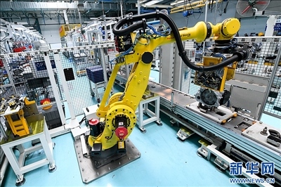在位于哈爾濱市平房區(qū)哈爾濱東安汽車動力股份有限公司生產(chǎn)車間,工業(yè)機器人在生產(chǎn)作業(yè)。