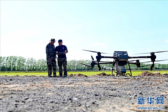 北大荒集團二九〇農(nóng)場有限公司農(nóng)技人員正指導種植戶使用無人機。