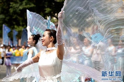 在哈爾濱市中央大街上,人們參加巡游慶?;顒?。