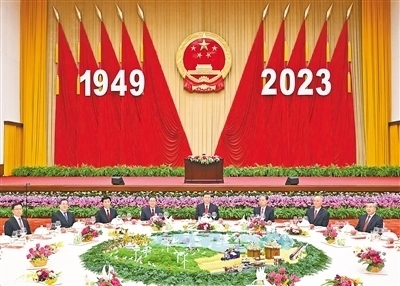 人民大會堂宴會廳華燈璀璨、鮮花綻放,洋溢著喜慶熱烈的節(jié)日氛圍。主席臺上方高懸著莊嚴(yán)的國徽,“1949—2023”大字年號在鮮艷的紅旗映襯下格外醒目。